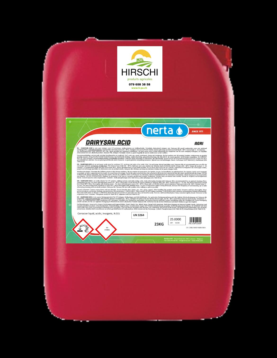 Dairysan Acid est un détergent acide qui convient aux installations CIP dans l’industrie alimentaire, aux installations de traite traditionnelles, aux tanks à lait et aux robots de traite Delaval et GEA. Un nettoyage alternatif périodique avec Dairysan Alk est recommandé pour un effet de nettoyage optimal. Pour un usage professionnel uniquement.